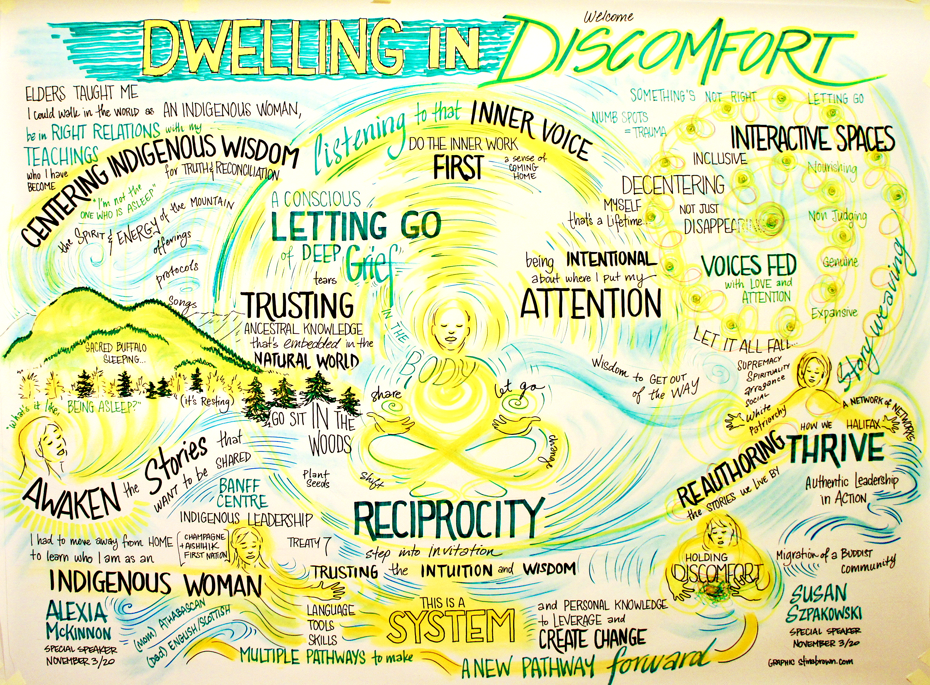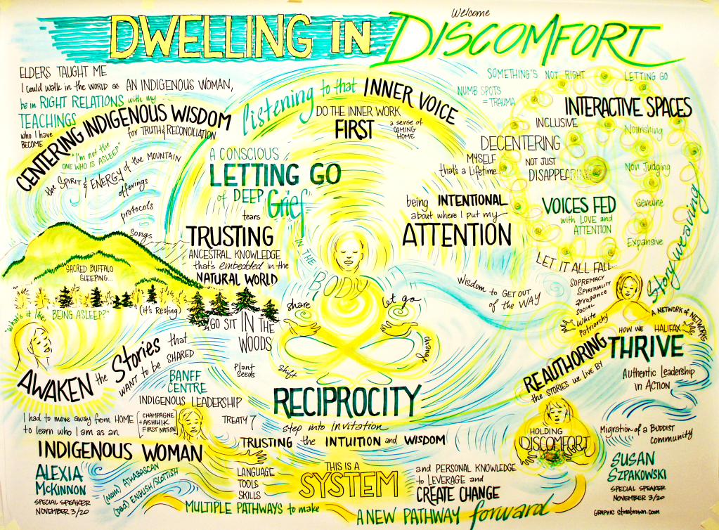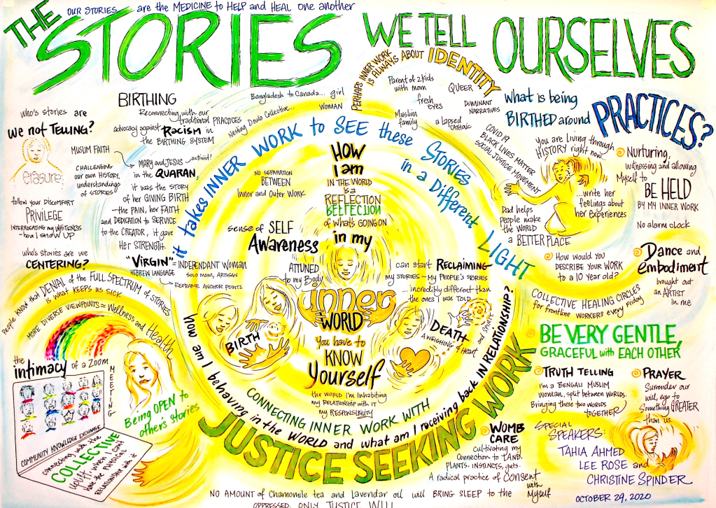 We come alive when we see our experiences reflected back in vibrant colour and the words we have spoken. We feel seen and heard which deepens our learning and relating. Something transcending enters a space when live artistic expression is integrated. It’s an invitation for others to activate creativity in themselves – their imagination, playfulness and rebellious originality! Stina has loved being an Artist in Residence (live visualizing for longer projects) and welcomes inquiries about this offering.